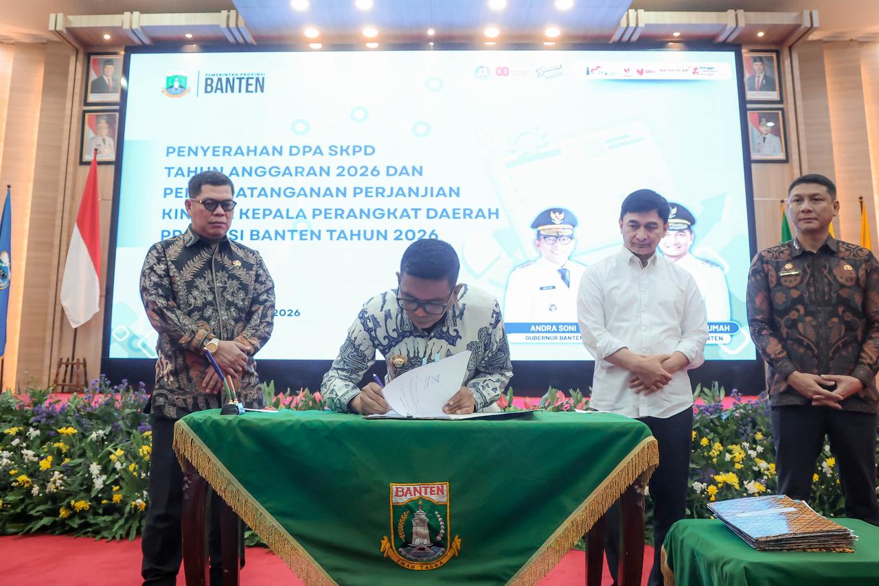 SERANG, PUBLISIA.ID – Gubernur Banten Andra Soni, secara resmi menyerahkan Dokumen Pelaksanaan Anggaran (DPA) Satuan Kerja Perangkat Daerah (SKPD) Tahun Anggaran 2026 sekaligus menyaksikan penandatanganan Perjanjian Kinerja Kepala Perangkat Daerah di Lingkungan Pemerintah Provinsi Banten. Dalam arahannya, Gubernur menginstruksikan seluruh Kepala Perangkat Daerah untuk mempercepat pelaksanaan program prioritas yang selaras dengan Rencana Pembangunan Jangka Menengah Daerah (RPJMD) dan kebijakan nasional.